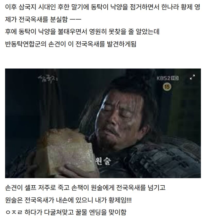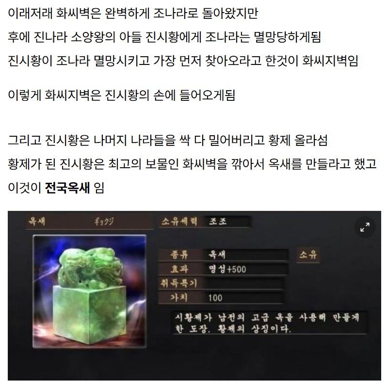 이후 진나라가 조나라를 비롯한 나머지 6국을 멸망시키고 전국을 통일한 뒤, 마침내 그 화씨지벽을 손에 넣은 진시황은 화씨지벽을 깎아 그 유명한 전국옥새(傳國玉璽)를 새겼다고 한다.[6] 이 전국옥새는 대대로 황제의 위엄을 상징하게 되었다. 후한 시절에 관련한 사건으로 삼국지 동탁 토벌전에 관련한 사건이 있다. 이 전국옥새는 진-한-삼국-위-진-남북조-수-당까지 이어지며 거의 천 년에 이르는 세월 동안 오래도록 전해져 오다가 후당이 멸망할 때 이종가가 현무루에 불을 지르며 함께 소실되었다고 한다.
